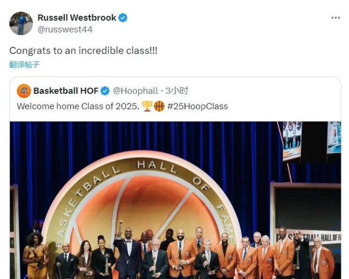 仍处于失业状态的威少,在个人社媒上向本届名人堂成员送出了自己的祝福:“恭喜他们,了不起的一届。”
