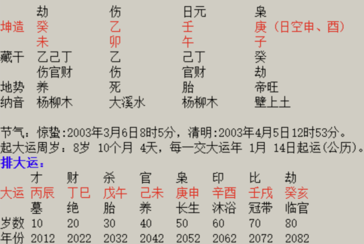 原局月柱乙卯,虽然干支一气的伤官,但以财作为配偶星,则不构成女犯伤官的情况。