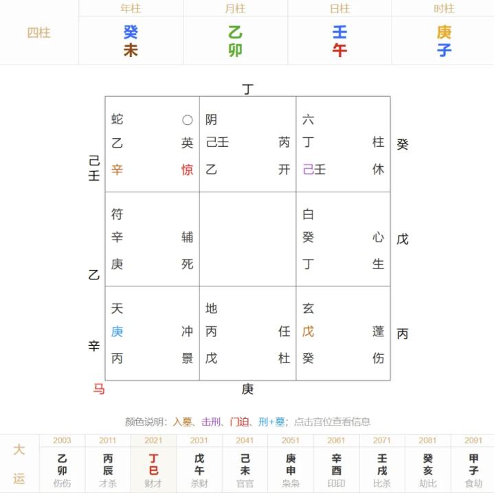 而坤宫地盘为己壬,分别在巽宫、离宫、坤宫同时出现,先在巽宫引干,说明这件事发生了,巽宫为辰、巳,引干配阴支,乙木正好是今年乙巳年,结婚的事情在今年出现。