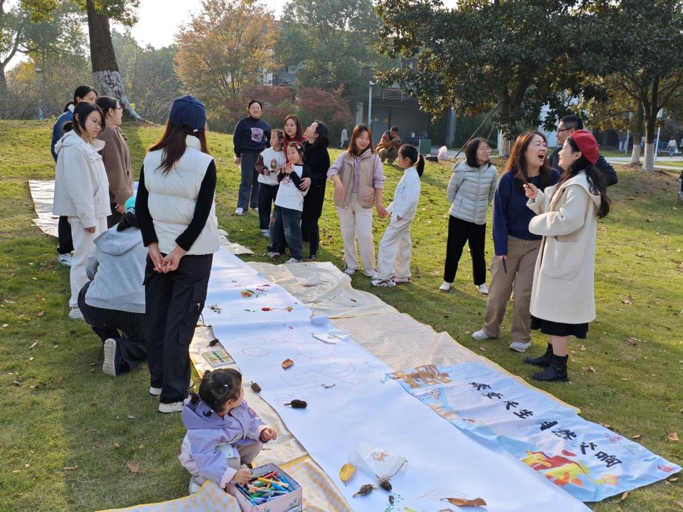 阳澄湖畔的初冬别有韵味,亲子家庭漫步其间,弯腰捡拾形态各异的落叶、光滑的石子与饱满的果实,一边采集自然材料,一边用心记录下风声、水声等自然回响。随后,大家以采集的自然物为原料合作创作拼贴画,为每一幅作品赋予独特的意义与名字。在“集体故事共创”环节,所有家庭围坐成圈,一人一句即兴接龙,编织出充满想象力的湖畔童话,最后通过讲述、表演等多种形式演绎故事,在创意与表达中完成了与自然的深度对话。