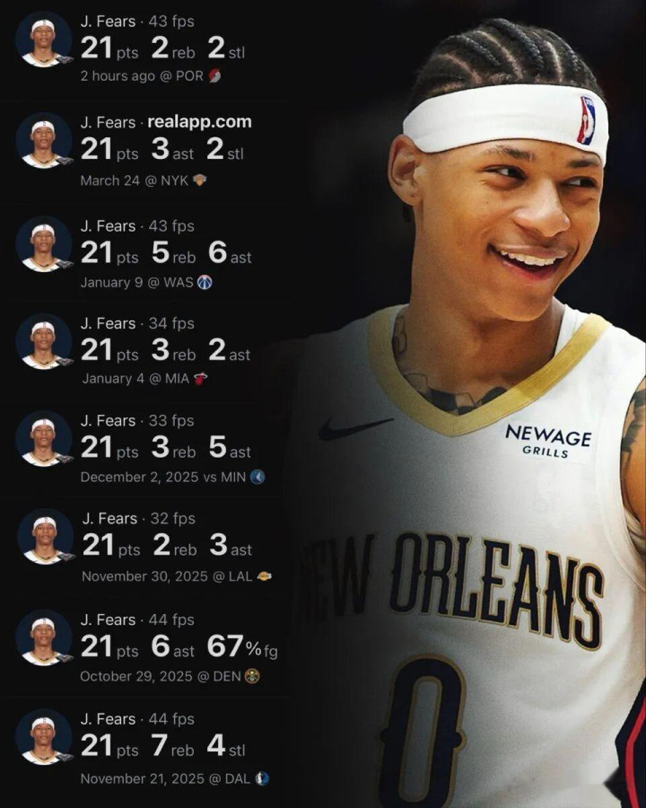 全场,鹈鹕新秀杰里迈亚-费尔斯打了38分钟,29投17中,3分球7投1中,罚球5中5,拿到了40分5板6助3断,正负值+30.
