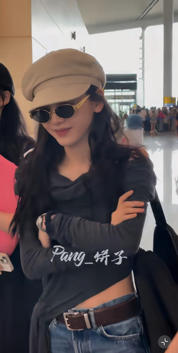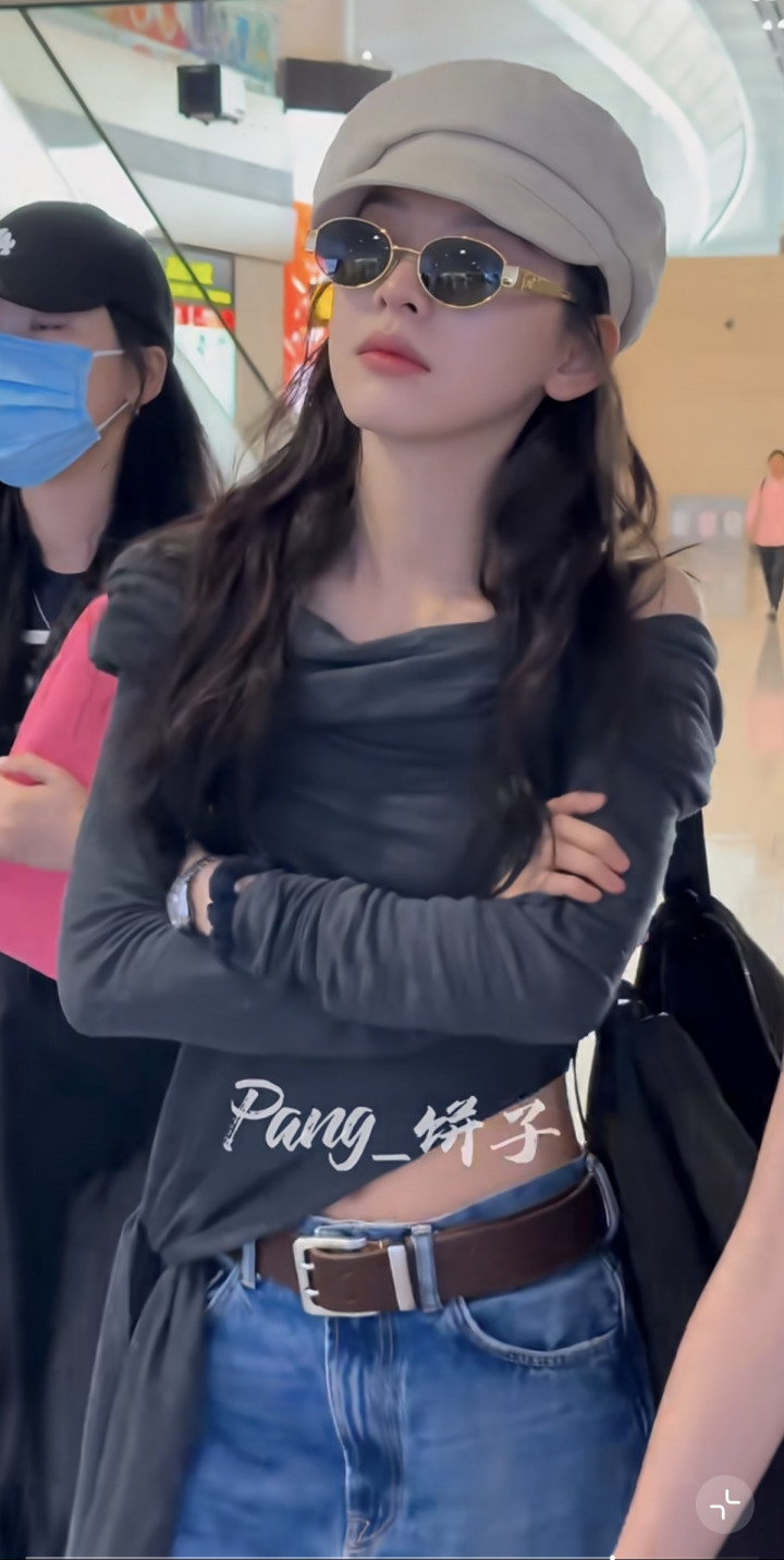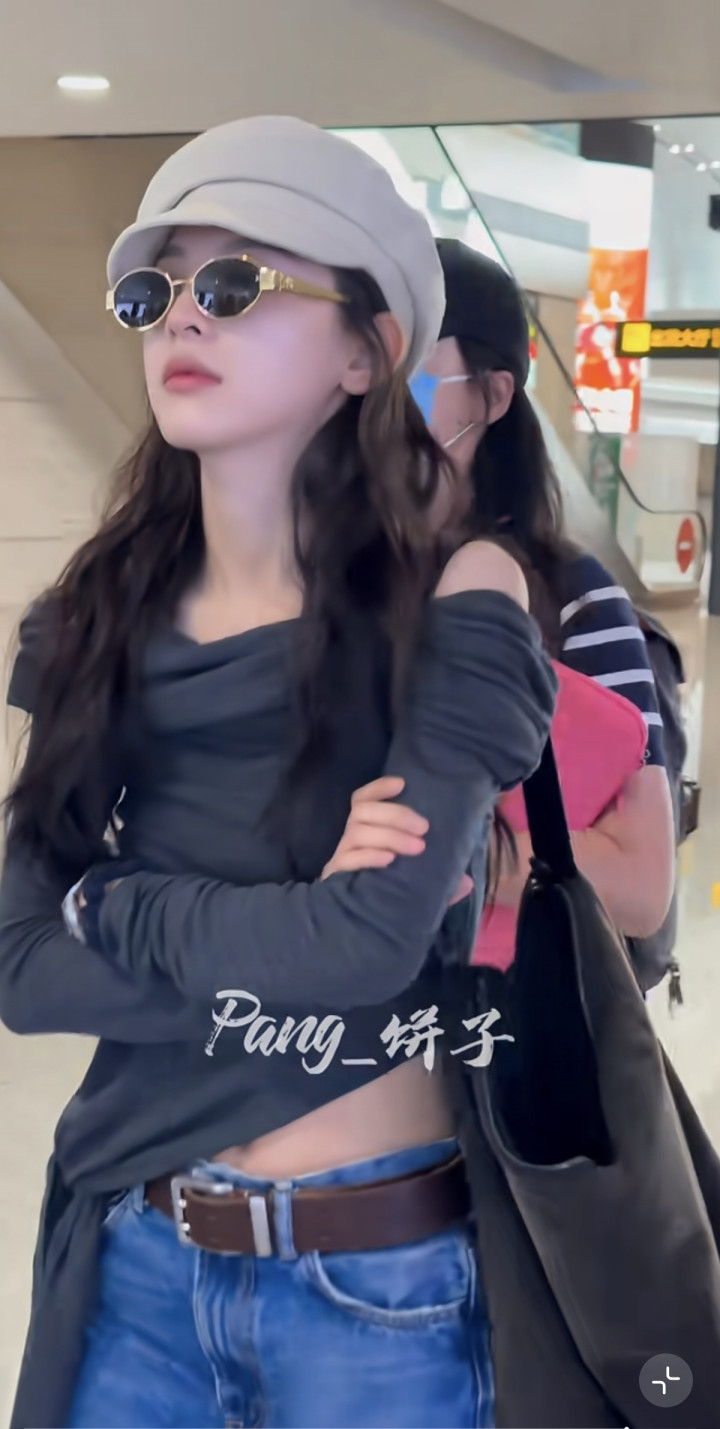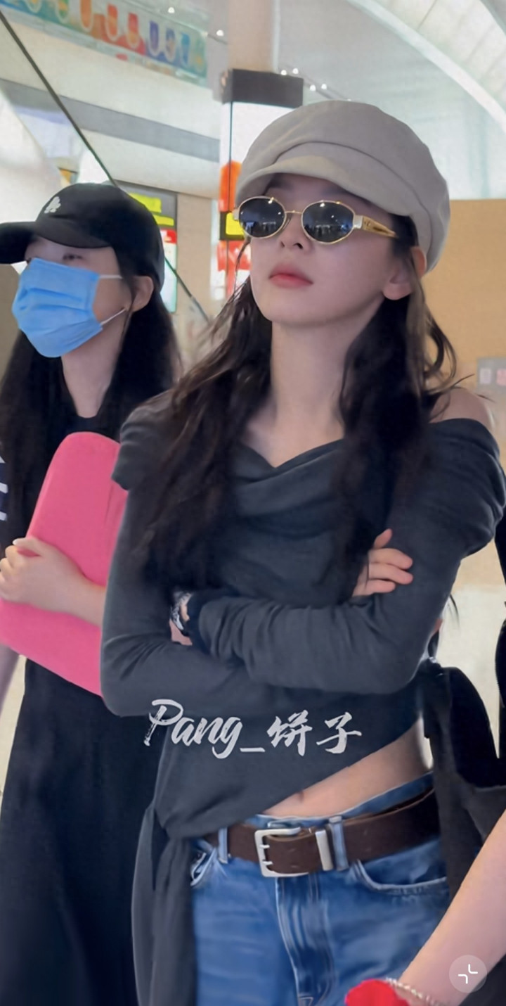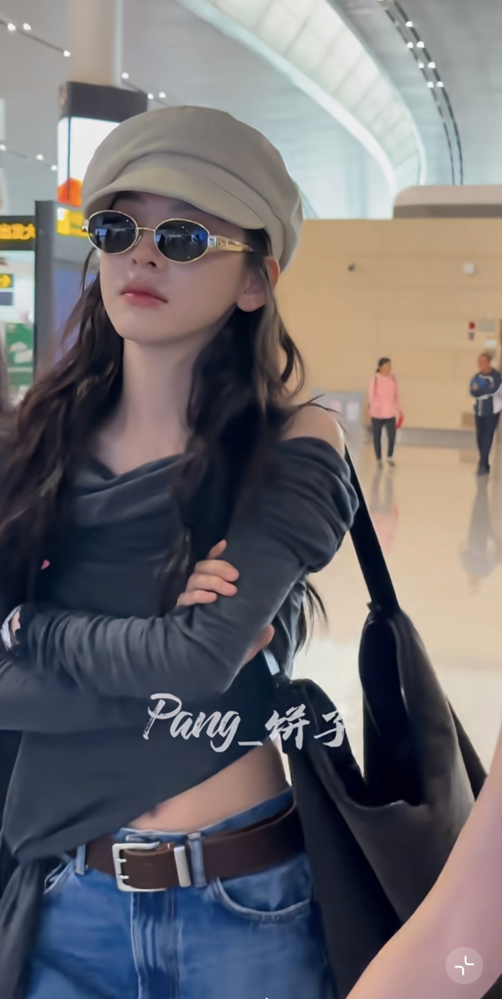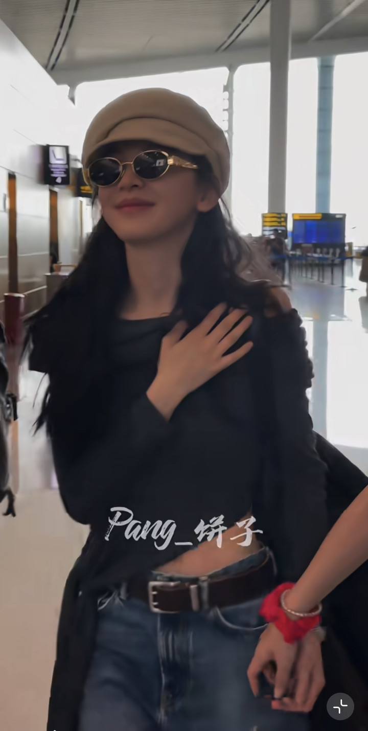 章若楠今日机场路透, 露肩长袖贝雷帽墨镜, 真又酷又飒好会穿呀!