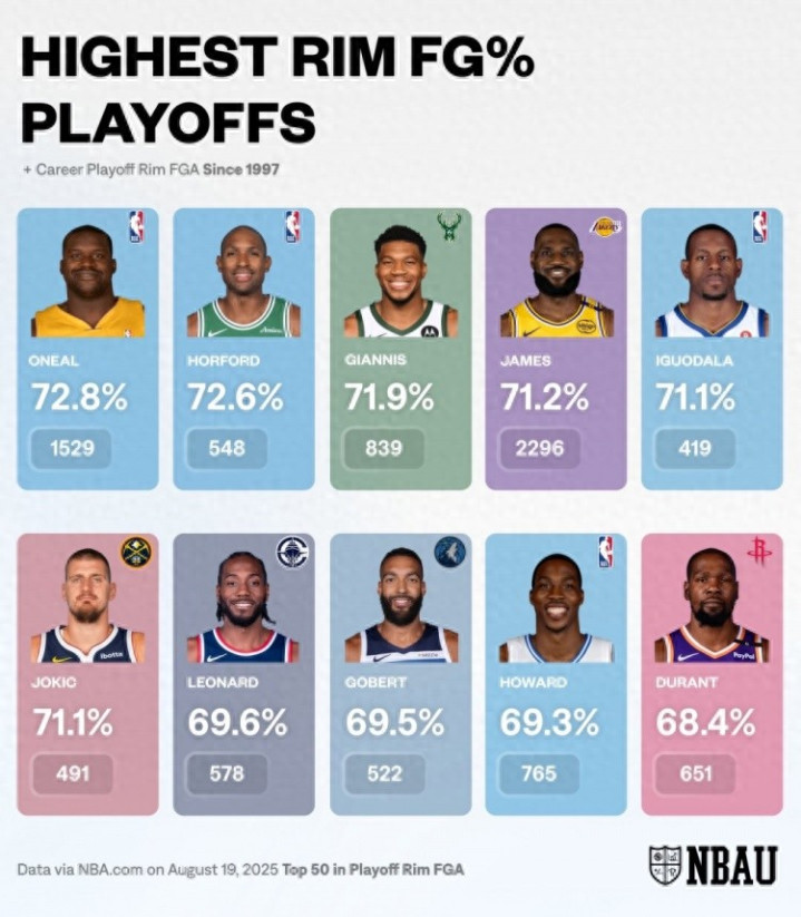 自1997年以来,NBA季后赛中得分效率最高的篮下高产得分手(统计范围为篮下出手次数前50)如下: