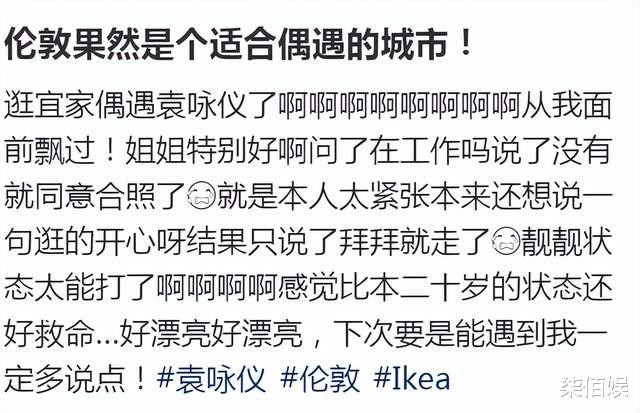 9月23日,有网友分享出在英国逛宜家时偶遇到演员袁咏仪动态。网友大赞袁咏仪本人特别好,即便当天是私人行程,但她并没有因为被打扰感到不开心,而且还很痛快答应网友合影要求。