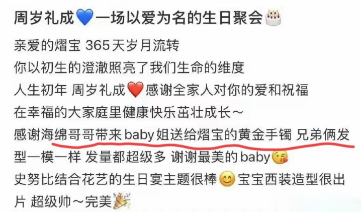 宴会结束后,黄晓明弟媳还特意发文感叹一家人以孩子生日的名义团聚在一起,很是感动,谢谢大家对宝贝的祝福,而且还特意感谢了前嫂子杨颖:“感谢海绵哥哥带来baby姐送给孩子的黄金手镯,兄弟俩发型一模一样,发量都很多,谢谢最美的baby姐”!